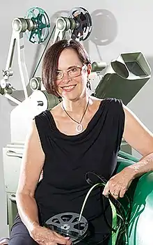 ![]() Joanna Priestley in her studio in 2013, with the Movieola she used to edit her 16mm films | |