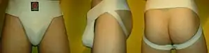 Alternatives to jockstraps include the jock brief, or support briefs, which have the wide waistband of a jockstrap combined with a full seat and are made of an elastic supportive material. A thong style strap, sometimes called a dance belt, has one narrow elastic strap attached to the bottom of the pouch, passing between the legs and attaching to the waistband at the middle of the back. A strapless garment, called a jock sock or sometimes a slingshot,[7] has only an elastic waist band with an elastic pouch that holds the genitals from the front.