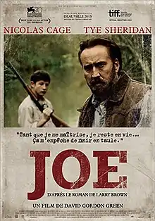 Joe is a 2013 American independent crime drama film directed and co-produced by David Gordon Green, co-produced by Lisa Muskat, Derrick Tseng and Christopher Woodrow and written by Gary Hawkins, adaptation from Larry Brown's 1991 novel of the same name. It stars Nicolas Cage and Tye Sheridan, revolving around a tormented man who hires a 15-year-old boy and protects him from his abusive father.