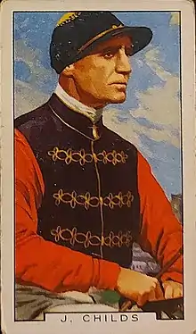 In 1919 he rode Bayuda to victory in the Oaks for Lady Douglas. He also rode Buchan, the odds-on favourite, for Lord Astor in the 1919 St. Leger, but got beaten. A dispute with Astor's racing manager over the matter meant he never rode for Astor again.[5] In 1921, Childs became stable jockey to Cecil Boyd-Rochfort.[6] The next few years were quieter by comparison with the big race victories of the war years, but in 1921 he won the Oaks on Love in Idleness and the Grand Prix de Paris on Lemonora, both for Joseph Watson (later Baron Manton), who had purchased the Manton estate. He also won a St Leger on Polemarch (1921) and a July Cup on Golden Corn (1923).