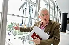 He vowed there would be a nationwide campaign of "people power" against any household and water charges.[55] In September 2011, Higgins committed to facilitating the nomination of Senator David Norris for a place on the ballot paper ahead of the 2011 Irish presidential election, despite multiple controversies enveloping the candidate.[56] On the occasion of the publication of the Keane report on mortgage arrears in October 2011, Higgins criticised Enda Kenny's government and said the report was "a banker's charter written by bankers".[57] His description of allowing the banks to solve their own problems as being "like sending a bunch of marauding foxes that had raided a henhouse back to give mouth-to-mouth resuscitation to their victims" was quoted several times by other commentators in the media.[58][59][60] Higgins addressed "The EU in Crisis" public debate, held at the Ireland Institute in Dublin in October 2011.[61] He served as Ruth Coppinger's election agent in the 2011 Dublin West by-election, held alongside the presidential election.[62] At her campaign launch Higgins said Taoiseach Enda Kenny was engaging in a "cynical manipulation of the political agenda" by delaying the publication of his government's comprehensive spending review until after the elections.[63]