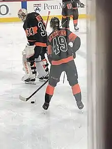 Farabee returned to the Flyers' training camp for the 2020–21 season having gained nine pounds and stating he felt "a lot more confident."[33] He made his season debut on January 13 against the Pittsburgh Penguins, during which he tied a franchise record for most points in a season-opener by scoring four points in the 6–3 win.[34] Later that month, Farabee scored his first NHL hat trick in a 4–3 overtime win against the Islanders, becoming the second youngest Flyers player to achieve this feat during the regular season.[35][36] He finished the season with 20 goals and 18 assists for a career high 38 points.[1] As such, Farabee was awarded the Pelle Lindbergh Memorial Trophy, given to the most improved Flyer as voted by his teammates.[37]