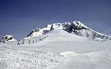 In the spring of 1845, Palmer traveled to Oregon without his family, as captain of a wagon train of 23 wagons. Stephen Meek served as the train's paid guide. Meek left the group at Fort Hall to lead some of the members on the Meek Cutoff.[7] The remaining parts of the wagon train reached the end of the overland Oregon Trail at the Columbia River, and unwilling to wait for transport down the dangerous Cascade Rapids, Palmer's party joined Sam Barlow's party in a quest for passage through the Cascade Range around the south side of Mount Hood. Palmer climbed to the 9,000-foot level of Mount Hood on October 7, 1845—with little food and the scant protection of moccasins—to scout a route off the mountains. This was Mount Hood's first recorded climb;[2][8] the Palmer Glacier on the mountain is named for him.[9]