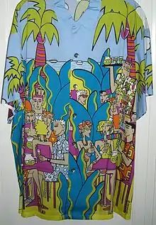 In 1985, Resnicoff began working with Esprit, and in 1986, two summer seasons of clothing, including brightly colored shirts and scarves, featured his designs—with his signature on each item. Using an unusual approach, the company commissioned Resnicoff to paint a series of "oversize summery murals," which Esprit then used as a basis for its "sassy...bold, and colorful" fabric designs.[19] In fact, Resnicoff's artwork for the summer designs were so successful that he was invited to repeat his collaboration with Esprit for an additional season, but by then he had to decline the invitation due to his failing health. In addition to his work with Espirit, Resnicoff also designed a series of Tee-Hee Shirts—pullovers and sweatshirts, and "cooking apparel"—aprons, gloves, and pot-holders, illustrated with whimsical characters similar to those on his Resnicards illustrations.