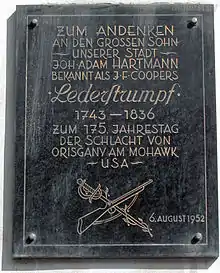 The city of Edenkoben dedicated a plaque to Hartmann on the occasion of the 175th anniversary of the Battle of Oriskany. Due to some computation error, that only got discovered after the plaque had been set up, it contains the wrong year of birth, 1743 instead of 1748.[1] The German sculptor Gernot Rumpf designed a fountain for the city of Edenkoben, which was completed in 1990.[3] The Lederstrumpfbrunnen (lit. Leatherstocking fountain) features three major statues of figures related to the Leatherstocking Tales, one of them is a statue of Hartmann/Bumpo displayed with a hunting rifle and a dog.