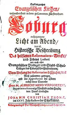 Thomae was born on 5 April 1668 in Heldburg at the house of his maternal grandfather. His father was Stephan Thomae,[2] the Lutheran pastor of Wiesenfeld bei Coburg and later of Neuhaus (now Neuhaus-Schierschnitz) and Sonnefeld. His mother was Cordula Buchenröder, the daughter of a Church Superintendent Michael Buchenröder.[3] Privately educated, Thomae came to Coburg in late May 1679 to join the Primary Class at the city's Collegiate School. In 1682, he was admitted to the Great Princely [Hochfürstliche] Gymnasium, also in Coburg, and graduated in 1686. From 1688 he studied at the University of Jena. After graduation, he worked as a teacher. In 1697, he was appointed as the Rector for the parish of Neustadt bei Coburg. Three years later, on 9 June 1700, he married Margaretha Dorothea Eyring (1675 – after 1715), the daughter of Johann Andreas Eyring,[4] the Lutheran pastor of Fechheim, and his wife, Anna Ursula Brechtold. With her, Thomae had five children, two boys and three girls.[5] In 1722 (ins XXVI. Jahr Rectore der Schul daselbst[6] [“in his 26th year as the Rector of the School”]) he published in Coburg his history of the Reformation of the Duchy of Coburg. He died on 19 March 1724.