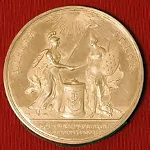 In 1782 Holtzhey designed two medals for John Adams, one to celebrate the Dutch acknowledgement of the independence of the Thirteen colonies on April 19, 1782, and one to celebrate the trade treaty with the Netherlands on October 8, 1782.[4] The face of the medal celebrating independence is in the collection of the Teylers Museum and declares “Libera Soror,” or “A Free Sister,” and depicts the Netherlands Maiden on the left as an armed woman and the United States on the right as a Native American woman. Holland uses a staff to place a Phrygian cap upon America's head, while America holds a shield bearing thirteen stars and rests a foot upon the head of a chained lion (representing England). The reverse shows the unicorn of the Royal coat of arms of the United Kingdom, prostrate with its horn broken against a rock cliff. The inscription reads, “Tyrannis virtute repulsa / sub Galliae auspiciis,” which translates to “Tyranny repelled by valor / under the auspices of France”,[5]