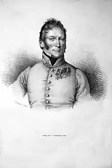 On 13 May 1809, as Major General of the Lower Austrian 49th Infantry Regiment, he succeeded in preventing the formation of a French bridgehead on the left bank of the Danube near Jedlesee, thereby enabling the deployment of troops under Archduke Charles in northern Vienna. The French under Napoleon, who occupied Vienna without a fight on the right bank of the Danube on the same day, were thus unable to cross the Danube until 20 May southeast of Vienna at the Lobau, where the Battle of Aspern then took place.[1][2][3][4]