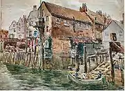 Chambers maintained a succession of studios at North Shields where, at times, he directed painting classes,[2] and at which he held exhibitions of his work, and occasionally those of fellow artists. It was also shown before being sold in large quantities by Bainbridge & Co., a North Shields auctioneers,[3] and featured in several local loan exhibitions. Despite frequent favourable comments on his work, he remained a quiet, diffident artist who died at his home and studio at Borough Road, North Shields, without really extending his reputation beyond his native Northumbria, although he is reputed to have lectured on art in other parts of the country,[4] was a regular visitor to the Berwickshire coastline,[5] and had also worked in Holland. Although much of this reputation rested on his nautical and landscape paintings he also etched subjects for sale locally and was an occasional illustrator of Tyneside publications. Among his less typical works were a number of portraits in watercolour, among these one of Henry Hetherington Emmerson now in the possession of the Laing Art Gallery. He also produced a sketch of Emmerson for the menu card of the annual Bewick Club dinner in 1889.