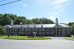 John D. Bassett High School, also known as Bassett Middle School, is a historic school building located at Bassett, Henry County, Virginia. It was built in 1947–1948, and is a two-story Georgian Revival style brick school building. A rear addition was built in 1961. It has three bay portico entrances at each end with cupolas above. They provide public access to the two community spaces on the interior – the auditorium at one end and the gymnasium at the other. The building features a hip roof with slate shingles, gabled dormers and octagonal cupolas; and Flemish-bond variant brickwork with corner quoins and a water table. It was replaced by the Bassett High School in 1979, and continued to operate as a middle school. The school closed in 2004.[3]