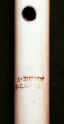 John Dunn (ca. 1764–1820) was a noted pipemaker, or maker of bagpipes. Born in Newcastle upon Tyne, England, Dunn was a cabinet maker by profession, initially a junior partner with George Brummell.[1] In the trade directories, he also appears in his own right as a turner (Whitehead 1790) and a plumb maker and turner (Mackenzie & Dent 1811). His address was Bell's Court, off Pilgrim Street. He was buried on 6 February 1820 in St. John's, Newcastle. His father may have been one John Dunn of Longhorsley; if so, he was born on 3 September 1764. He should not be confused with one M. Dunn, the maker of several surviving sets of Union pipes.