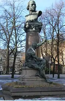 The stamp commemorating John Ericsson on April 20, 1926, coincided with the unveiling of the Ericsson Memorial in West Potomac Park, Washington, DC directly south of the Lincoln Memorial. The stamp pictures the memorial design by J. H. Frazer. The seated figure of Ericsson has the figures above and behind him of Vision, Labor and Adventure.[35]
