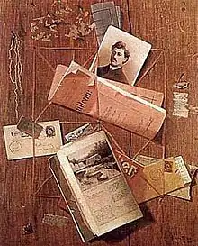Although Peto and the slightly older Harnett knew each other and painted similar subjects, their careers followed different paths. Peto was born in Philadelphia, Pennsylvania, and studied at the Pennsylvania Academy of the Fine Arts at the same time as Harnett.[1] Until he was in his mid-thirties, he submitted paintings regularly to the annual exhibitions at the Philadelphia Academy. In 1889, he moved to the resort town of Island Heights, New Jersey, where he worked in obscurity for the rest of his life. He and his wife took in seasonal boarders, he found work playing cornet at the town's camp revival meetings, and he supplemented his income by selling his paintings to tourists.[2] He never had a gallery exhibition in his lifetime.[3] Harnett, on the other hand, achieved success and had considerable influence on other artists painting in the trompe-l'œil genre, but even his paintings were given the snub by critics as mere novelty and trickery.