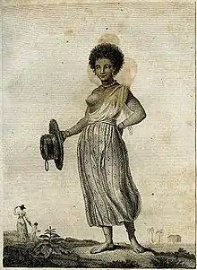 Stedman first mentions Joanna by name in his journal on 11 April 1773 in relation to his negotiation with her mother for the purchasing of Joanna's sexual and domestic services: "J—, her Mother, and Q— mother come to a close bargain with me, we put it of for reasons I gave them."[28][34] Stedman eventually negotiates an arrangement with Joanna's mother, which he indicates in this diary entry: "J—a comes to stay with me. I give her presents to the value of about ten Pound sterling and am perfectly happy."[34] In the 1790 manuscript edition of Stedman's travel narrative, edited and expanded on from his travel diary, he praised the physical appearance of Joanna, "bespeaking the Goodness of her heart".[36]