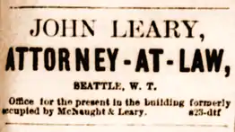 Leary was admitted to the bar in 1871, becoming a "pioneer lawyer" in Washington Territory.[25][34] That same year, he became a junior partner in McNaught & Leary law firm.[35][26] In 1872, McNaught & Leary was one of five law firms in Seattle[36] and one of the six most active law firms in Washington Territory.[37] One of Leary's most consistent occupations in Seattle was law; he was active in this area for eleven years.[25][38]
