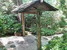 Of special interest in the garden are the winding stepping-stone walkways and gravel paths, stone lanterns, bamboo groves, a variety of mosses and a waterfall emptying into a koi pond.[12][13][4][5] The bamboo is used for fences, for bottom of the tea house and as a water pipe.[9] Japanese maples were planted as well as other Japanese trees, shrubs and groundcovers.[9] In addition, there are more than 11 species of moss.[10]