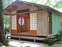 Upon return from a trip to Kyoto, Japan in 1960, John Portner Humes, a lawyer then ambassador, began work on a Japanese garden.[1][2] As a lawyer Humes worked for Mitsubishi and traveled to Japan for business.[3] The garden was designed between 1962-1965 by Douglas and Jone DeFaya who used Japanese shrubs, trees and ground cover as well as symbolic placement of stones.[4][3] The focal point of the garden is an imported tea house, in the design of the Ashikaga period, that was acquired in 1962.[5][3] The sandalwood tea house was prefabricated in Taiwan and featured straw matting and rice paper door panels.[6]