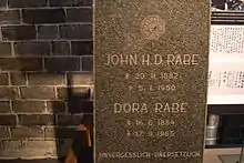 Born in Hamburg on 23 November 1882, Rabe pursued a career in business and worked in Africa for several years. In 1908, he left for China, and between 1910 and 1938 worked for the Siemens AG China Corporation in Mukden, Peking, Tientsin, Shanghai and later Nanking.[1] Rabe suffered from diabetes by the time he worked in Nanking, requiring him to take regular doses of insulin.[2] At the time of the Japanese attack on Nanking, Rabe was a staunch Nazi and the party's local head, serving as a Deputy Group Leader in the Nazi Party.[3]