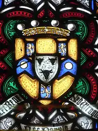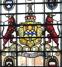 Rolle died in 1842 at Bicton House in Devon.[35] As part of her re-building of Bicton Church as St Mary's Church, completed in 1850, his widow Louisa retained as a Rolle mausoleum part of the ruins of the ancient Church of the Holy Trinity on the site and erected therein an elaborate monument to the memory of her husband, designed by Pugin and sculpted in the London workshop of George Myers. It consists of a Gothic-style chest tomb in front of a high arch filled-in with Gothic-style tracery and sculpted figures. In the same mausoleum is the baroque monument to his distant cousin Denys Rolle (1614–1638), who had inherited Bicton from his mother Anne Denys. He was third in descent from John Rolle (died 1570), the eldest son and heir of the patriarch George Rolle (died 1552) of Stevenstone, MP for Barnstaple. The Rolle Mausoleum is the private property of Lord Clinton and is not open to the public as from 2012.