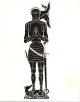 A fragment of his monumental brass survives in Ulcomb Church, now displayed as a mural in the north aisle. The inscription is lost, but is said to have been: Here lyeth John Seintleger Esquyer, and Margerie his wyfe, sole daughter and heir of James Donnett ... 1442.[15] A rubbing showing the date 1442 survives in the collection of the Society of Antiquaries.[16]