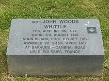 John Woods Whittle, VC, DCM (3 August 1882 – 2 March 1946) was an Australian recipient of the Victoria Cross, the highest decoration for gallantry "in the face of the enemy" that can be awarded to members of the British and British Commonwealth armed forces. Whittle was serving as a sergeant in the First World War when he was decorated with the Victoria Cross following two separate actions against German forces during their retreat to the Hindenburg Line in 1917. In the latter action, he attacked a machine gun crew, killing the group and seizing the gun.