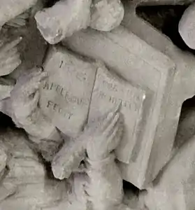 Leeds Central Library is a listed building,[67] designed as municipal buildings by George Corson to complement the Town Hall. The foundation stone was laid in 1878,[68] and the building was completed in April 1884.[69][70] Appleyard led the team of stone carvers who worked on the interior staircases, pillars and arches (except for the alabaster entrance-hall arch, carved by Farmer & Brindley).[3][71][38]:70 His name and Corson's are engraved in a ratepayers' ledger which features on a carved roundel "high on the wall" of the entrance hall, between the staircases: on the left-hand page "1883 Appleyard fecit", and on the right, "G. Corson architect". The other stone carvers of the interior staircases and arches have not been identified, and the extent of Appleyard's contribution to the artwork is unknown.[9][nb 11]