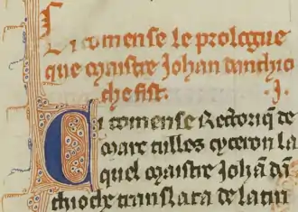 At the request of fellow Hospitaller William of Santo Stefano,[lower-alpha 1] John translated Cicero's De inventione and the anonymous Rhetorica ad Herennium. At the time these works were considered two parts of a singular work of Cicero's on rhetoric. John's translation thus came under the title Rectorique de Marc Tulles Cyceron.[lower-alpha 2] It was completed at Acre in 1282.[lower-alpha 3] The manuscript presented to William—now Chantilly, Musée Condé, MS fr. 433 (590)—also contains a preface, an epilogue on the methodology of translation and a treatise on logic. These parts may also have been completed at Acre in 1282 or perhaps a little later in Cyprus.[8] The preface and the treatise on logic are in a different hand from the rest of the manuscript,[8] which is probably in John's hand.[4][9] The epilogue was written by John (and thus probably at Acre in 1282). The treatise on logic consists of excerpts from Boethius' De topicis differentiis, most likely translated but probably not selected by John.[8][10]