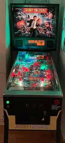 Johnny Mnemonic is a 1995 pinball machine based off the movie of the same name, created by George Gomez and Williams Electronics, with artwork by John Youssi. Designer George Gomez had been inspired by author William Gibson's original cyberpunk short story Johnny Mnemonic, but based the game and its features, such as a player-controlled glove that used a magnet to lift the ball off the playfield, on the film's assets. Unfortunately, the film was a box office failure, and its poor showing affected sales of the game despite high pinball ratings.[6]