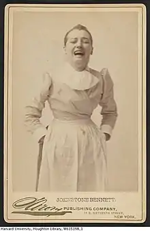 Johnstone Bennett was with a small touring company when she was discovered by Richard Mansfield and cast in Monsieur (1887) in Madison Square Theatre.[5] Still with Mansfield's company, she appeared in Prince Karl (1887), Lesbia (1888), A Parisian Romance (1888), and Beau Brummell (1890). She also appeared in Honor Bright (1888), All the Comforts of a Home, A Noble Son (1889), The Story of Rodion (1895), and in starring roles of Jane (1891),[6] The Amazon, Fanny,[7] and A Female Drummer (1898). In vaudeville she performed in sketched titled A Quiet Evening at Home and American Types.[8][9][10][11]