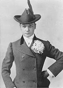 Bennett wore masculine clothing and short hair, both on and off the stage. She collected cuff buttons and shirt studs,[12] and had her skirts made with trouser-style pockets.[13] She hired a male valet instead of a maid or press agent,[14] and she lent her name to a haberdashery company in New York.[15] In 1899 she caught a mouse in her dressing room, and planned to keep it for a pet.[16]
