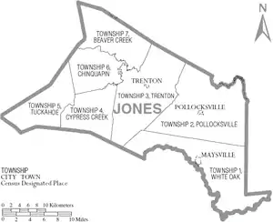 - Maysville (largest town, Split between Jones and Onslow)