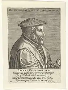 Joos de Damhouder (25 November 1507, Bruges – 22 January 1581, Antwerp), also referred to as Joost, Jost, Josse or Jodocus (de) Damhouder, was a jurist from Bruges, in the County of Flanders (then part of the Seventeen Provinces). His writings had a lasting influence on European criminal law.