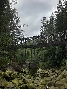 The Vancouver Island Power Company, a subsidiary of British Columbia Electric Railway, completed construction of the smaller Bear Creek Dam and the main Jordan River Diversion Dam in 1911. At 126 feet (38.4 metres) from top to bottom, the Diversion Dam was upon its construction, the highest dam in Canada.[2] Water flowed through a 31,600 ft long flume to the penstock above the power house.[3] The construction of the dam, due to its remoteness, required the construction of a three-foot narrow gauge railway as well as a cable-railway for the initial ascent from Jordan River.[3] From 1912 to 1931 continual improvements and additional generators pushed the capacity of the power house to 26 megawatts.