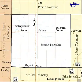 According to the 2010 census, the township has a total area of 40.56 square miles (105.0 km2), of which 40.55 square miles (105.0 km2) (or 99.98%) is land and 0.02 square miles (0.052 km2) (or 0.05%) is water.[2] The small town of Pence lies near the western edge of the township, which is also the Illinois border. An even smaller town, Stewart, is located about 2 miles (3.2 km) east of Pence and now consists mainly of a grain processing facility. Near the southern border of the township lies the town of Hedrick. The town of Sloan once existed just east of Hedrick but no buildings now remain. Likewise, the town of Sycamore Corner was 2 miles (3.2 km) east of Stewart at 40°21′36″N 87°26′04″W but is now entirely gone.