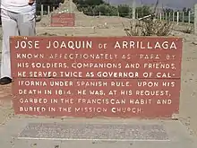 José Joaquín de Arrillaga died at Mission Nuestra Señora de la Soledad on July 25, 1813 and was buried there.[8] He is the only Spanish governor to be buried in California and US soil.[8][9] ( however this must be wrong, for the Spanish Govenor before him, José Antonio Roméu, was buried at Carmel Mission in 1792.) José Joaquín de Arrillaga's grave is at 36°24′17″N 121°21′19″W.[10] The sign there has the inscription: "Known affectionately as "Papa" by his soldiers, companions and friends, he served twice as governor of California under Spanish rule. Upon his death in 1814 he was, at his request, garbed in the Franciscan habit and buried in the mission church." He was called "papa," because he worked hard to improve the lives of his men.