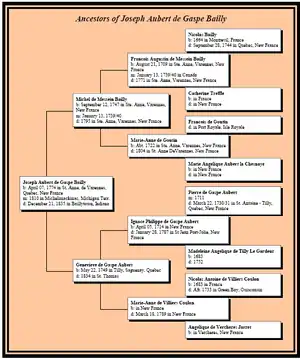 Joseph Bailly was an early fur trader on the Great Lakes. He and his children had significant influence as the region transitioned from English colonialism to frontier expansion of the United States. He was born Honore Gratien Joseph Bailly de Messein on 7 April 1774 in Verchères, Quebec; a village which originated with a land grant to his great-great grandfather Francois Xavier Jarret, Sieur de Vercheres in 1672.[1] It is located 20 mi (32 km) up the Saint Lawrence River from Montreal, on the opposite bank. Bailly was a sixth–generation French-Canadian, descending from Jehan Terriault and Perrine Brault, who were original colonists in Acadia in 1637. Bailly's great-grandfather Nicholas Antoine Coulon, Sieur de Villiers was a trader and Army officer who was killed by Fox Indians on the shore of Green Bay, Wisconsin in 1733. His uncle, Father Charles-Francois Bailly de Messein, spent more than twenty years as a Catholic missionary to the Mi'kmaq Indians of Nova Scotia, and was appointed coadjutor Bishop of Quebec in 1788. Following the family interest in the fur trade, Joseph Bailly received an advanced education in Montreal, and served a clerkship with the North West Company. In 1792, at the age of 18, he finished his education, and entered the fur trade at Michilimackinac. Although from a prominent family, they had little money. His father died in 1795, and Joseph became the main support of his mother, younger brother, and sister for several years.[2]