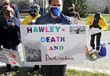 In the wake of the riot, other Republican lawmakers tried to persuade Hawley to abandon his objections to Biden's win,[136] but he voted in support of the objections to the electoral votes for Arizona and Pennsylvania, making baseless claims that Pennsylvania election officials violated state election laws.[137] Both senators from Pennsylvania, including Republican Pat Toomey, rejected his objections, and the Senate rejected his objections by votes of 6–93 and 7–92, respectively.[138] Some political commentators and Democratic lawmakers dubbed Hawley and other senators who sought to overturn the election the Sedition Caucus.[139] Hawley has since faced bipartisan calls for his resignation,[122][132][140][141] to which he has responded that he "will never apologize for giving voice to the millions of Missourians and Americans who have concerns about the integrity of our elections."[142] Thousands of law school students and alumni, including at Hawley's alma mater Yale Law School, also called for Hawley and Cruz to be disbarred.[143] On January 9, hundreds of protesters assembled in Downtown St. Louis in front of the Old Courthouse to demand Hawley's resignation.[144][145]