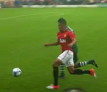 At the start of the 2009–10 season, King came on as a substitute for Zoran Tošić in the final of the Lancashire Senior Cup, a 1–0 win over Bolton Wanderers.[20] He then started the reserves' first three league games of the season,[21][22][23] and was rewarded for his performances by being given a place on the bench for the first team's League Cup third round match against Wolverhampton Wanderers on 23 September 2009. He was given the number 41 jersey and came on as an 81st-minute substitute for goalscorer Danny Welbeck. Although King had two opportunities to add to United's lead, the match finished 1–0 and United progressed to the fourth round of the competition.[24] He was again named as a substitute for the fourth round match against Barnsley, but he did not take to the field.[25] King was an integral part of the under-18s side for the remainder of the season, scoring six goals in 14 appearances as the team won Group C of the 2009–10 Premier Academy League;[26] they were drawn against Arsenal in the play-off semi-finals, and although King scored his penalty in the shoot-out after the match finished in a 1–1 draw, Arsenal ultimately won 5–3.[27]