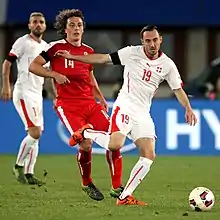 On 13 May 2014, Drmić was named in Switzerland's squad for the 2014 World Cup.[37] He scored the only goal of the match in the 83rd minute from Blerim Džemaili's assist as Switzerland beat Jamaica in a warm-up match for the tournament on 30 May. In the first match of the tournament, a 2–1 win over Ecuador, he had a goal ruled out for offside and was substituted for Haris Seferovic, who scored the winning goal.[38] Drmić was dropped for Seferovic for the second match, a 5–2 defeat to France, but returned and set up two of Xherdan Shaqiri's three goals in the 3–0 win over Honduras in the last group match in Manaus, which saw Switzerland advance to the knockout stage as group runners-up.[39]