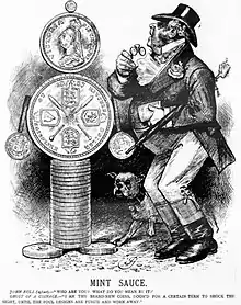 Boehm's fellow artists joined in the chorus. Edward Poynter, opening an art exhibition in South Kensington on 28 July, stated, "The head was modelled by Mr Boehm, and making all allowance for the necessity of pleasing an illustrious patron, that may have led Mr Boehm to accept such structural absurdities as the toy crown and the straight veil, it was difficult to believe that a sculptor of his eminence should have turned out such a thoroughly bad work. For the head is bad all over ... Some of the new heraldic devices are the poorest things of the kind we have ever had."[39] Lewis Foreman Day criticised the new coins in The Magazine of Art, "British sculptors are justly aggrieved when a production is put forth, presumably as the best we can do, when they themselves know it to be very far from representing the standard of national design, and it aggravates their grievance to think that the favoured artist bears not even an English name".[40]