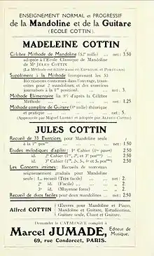 Jules Cottin (1868–1922) was a mandolin virtuoso who played in Paris from the 1890s. A pupil of the guitarist Jacques Bosch,[1] he became part of the mandolin revival, which revitalized the instrument after its long decline in the 19th century. He was part of a group of virtuosi mandolinists, including Giuseppe Silvestri, Ferdinando de Cristofaro, and Jean Pietrapertosa, who played before enthusiastic Paris audiences. He was also a composer and author, writing the 1891 mandolin method book, Celèbre Méthode Complète Theoretique et Pratique de Mandoline.