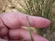 The stems of the plant grow vertically, growing 60–120 cm high.[1] The stems are tough and not easily squashed or broken. The colouration of the culm is relatively dull, with no shine, and ranging from green to blue-green or grey-green. The diameter of the culm ranges from 1.5 millimetres to 4 millimetres,[1] with each stem having 30-60 striations, having a consistent distance between each striation. The pith is not solid throughout the culm, generally having large, non-continuous air pockets throughout the stem.[4]