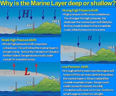 A strong low pressure system passing over southern California will produce the deepest and most extensive June Gloom marine layer. The marine layer effect is weakened when a weak high pressure system is in place over the region, and the marine layer will be very weak or nonexistent when there is a strong high-pressure system affecting southern California. The National Weather Service graphic on the right explains the effects of atmospheric conditions upon the marine layer and local weather conditions in more detail.
