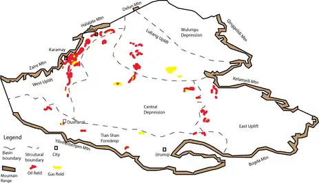 Junggar Basin contains the third-largest petroleum reservoirs in China.[3] About two-thirds of oil can be found in the Karamay-Urho monocline area.[3] There was formed in Carboniferous deep-sea sedimentary rocks and lake sedimentary layers from Permian to Tertiary.[3][25] For Carboniferous oil and gas deposits in this area, they were moved upward and accumulated in the Permian period and Mesozoic era sandstones.[26] Then, the layers altered as the structural trap locations by tectonic activities in the later stage.[26] Petroleum is dominant in Karamay, Baikouquan, Urho, Dushanzi, and Qigu.[25][3] The oil and gas fields can be found on Tertiary Dushanzi sandstone.[3][25] Besides, gas fields are found in the Karamay as well as the inland region of the basin.[24]