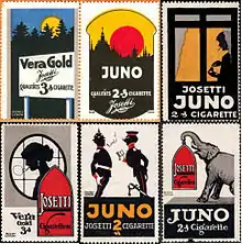 Juno was launched in 1896 with new Virginia tobaccos from the Berliner Cigarettenfabrik "JOSETTI". To distinguish between flat oriental cigarettes with an oval cigarette cross section, a thick and round shape was chosen.[4] The slogan of the launch phase was "Thick and round", also to be found on the cigarette packs of the Gründerzeit. The name "Josetti Juno" was registered on February 9, 1898 at the DPMA under no. 34169.[5] and is still maintained by the Hamburg Reemtsma Cigarettenfabriken GmbH.