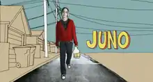 Juno's opening title sequence, depicting a rotoscoped Juno walking through her town while drinking a bottle of SunnyD orange drink, was put together over 7–8 months[39] by a small design studio, Shadowplay Studio, based in Los Angeles.[58] Reitman had met the studio's co-founder Gareth Smith in Japan on the short film festival circuit where they each had shorts screening.[58] Shadowplay created the opening title sequence for Reitman's previous film, Thank You for Smoking, and he contacted them again when he found out he was going to direct Juno.[59] With vintage 1970s punk-rock posters as inspiration, Smith and artist Jenny Lee decided to create a sequence that "had texture and a little bit of edge, but also imparted the warmth and heart of the screenplay".[60] In the last days of filming in Vancouver,[60] Page was photographed with a high speed camera from a number of angles walking on a treadmill and drinking SunnyD.[58] 900 still images of a walking and drinking Page were printed out and repeatedly run through a Xerox machine to degrade their quality until the pictures appeared hand-drawn.[59] The pictures were cut out and scanned back onto the computer, then layered onto the background drawn by Lee with compositing software[58] to create a stop motion animation sequence that corresponded to "All I Want Is You" by Barry Louis Polisar, the song Reitman had chosen.[50] Shadowplay also designed the titlecards for each of the seasons for the film,[39] hand-made a custom typeface for the opening title sequence and the closing credits, and collaborated on the design of the soundtrack and the DVD.[60]