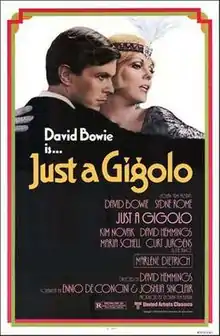 Just a Gigolo (German: Schöner Gigolo, armer Gigolo, lit. 'Nice Gigolo, Poor Gigolo') is a 1978 West German drama film directed by David Hemmings and starring David Bowie. Set in post-World War I Berlin, it also features Sydne Rome, Kim Novak and Marlene Dietrich in her final film role.