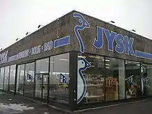 Jysk A/S (Danish: [ˈjysk]) is a Danish retail chain, selling household goods such as mattresses, furniture, and interior décor. Jysk is the largest Danish retailer operating internationally with over 3,100 stores in 49 countries.[1] Jysk (meaning "Jutlandic") was founded by Lars Larsen, who opened the first store on Silkeborgvej in the Danish city Aarhus in April 1979.[2] It is owned by the founder Lars Larsen's family through the holding company Lars Larsen Group which also owns wholly or partly the furniture chains ILVA , IDÉmøbler, IDdesign, Bolia.com and Sengespecialisten.[3] The logo displays a goose, which has a historical thread to the brand.[4] Due to the Scandinavian design for its products, it is also called the Danish IKEA in a small format.[5]