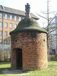 The Wusterhausener Bär (or Wusterhausischer Bär) is a small round tower, with tiled walls and a helmet-shaped sandstone cupola topped with a carved trophy display of weaponry, which was formerly part of a weir regulating the water level in the ditch that formed part of the wall defences. Bär in this case derives from the Latin berum, meaning "weir",[2] and it was apparently named for Wusterhausen because the road to that town passed by its original location at Bastion VII.[17] It was moved to the park in 1893 and is now incorporated into the Lapidary.[1] It is listed as a Berlin landmark.[18]