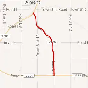 K‑60 begins at an intersection with US‑36, roughly 11 miles (18 km) east of Norton and 19 miles (31 km) west of Phillipsburg. The highway heads north, surrounded by a grassland terrain marked with several fields. The road turns northwestward. After an intersection with Main Street, K-60 turns back northward towards Almena.[2] The highway ends at an intersection with K-383 near the Kyle Railroad.[3]